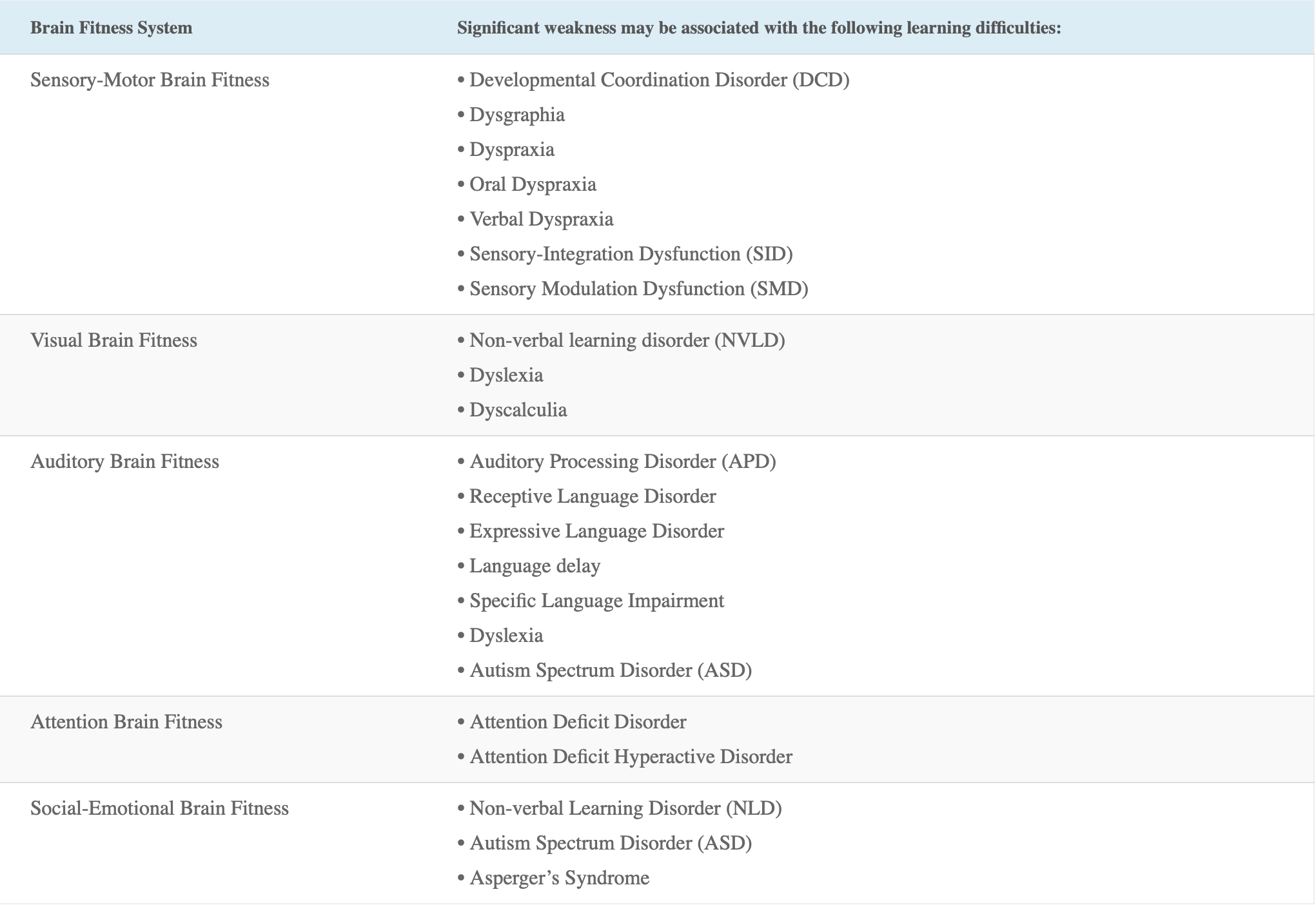 A child demonstrating learning or behavioural problems, little interest in school work or difficulties in reading, writing, grasping Maths concepts or under-achieving in school, may be experiencing weaknesses in his or her visual, auditory, sensory-motor, attention or social-emotional brain fitness. When these weaknesses become significant, the child may fall within the diagnostic criteria of having a learning difficulty or disability.